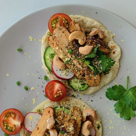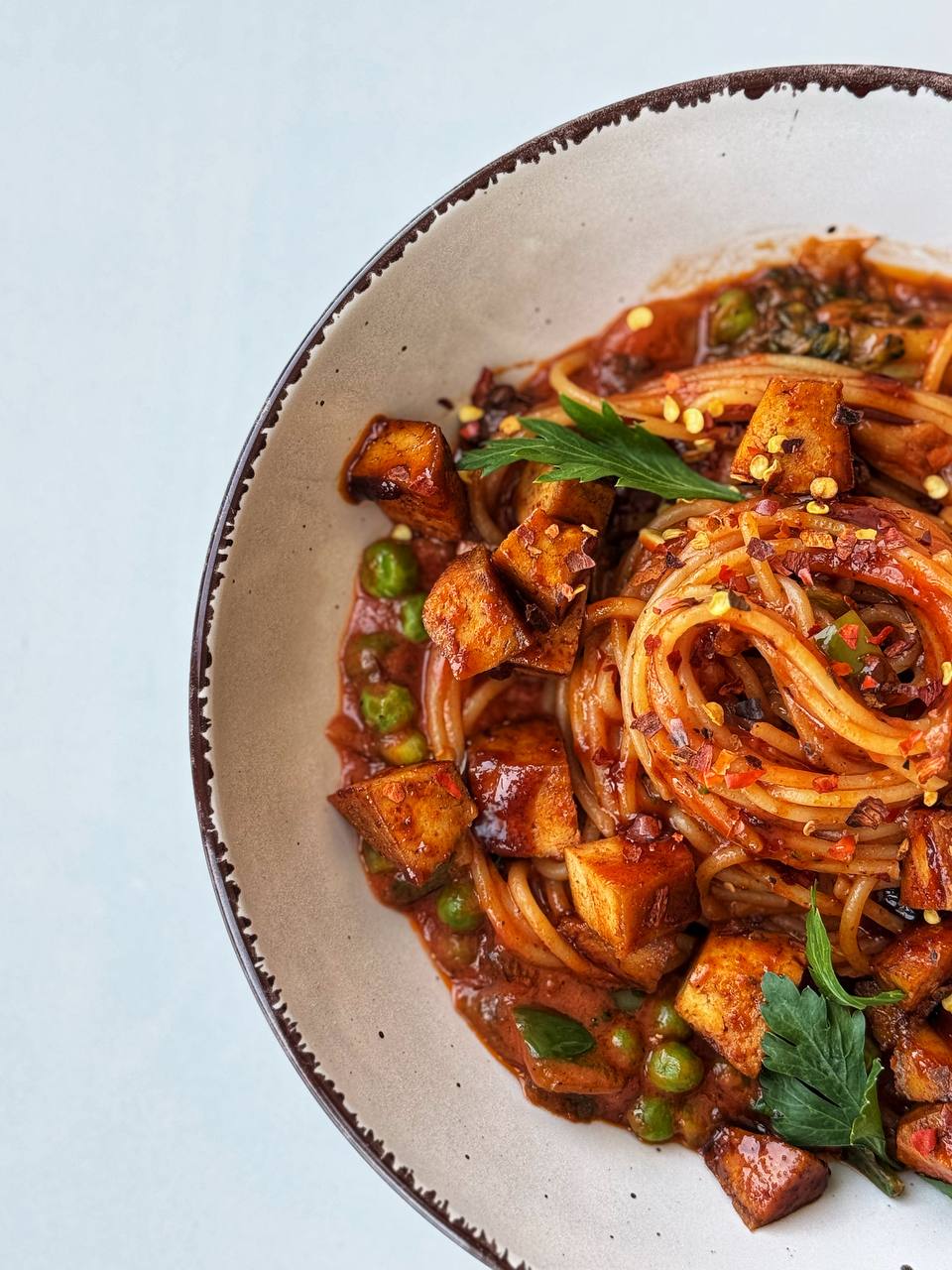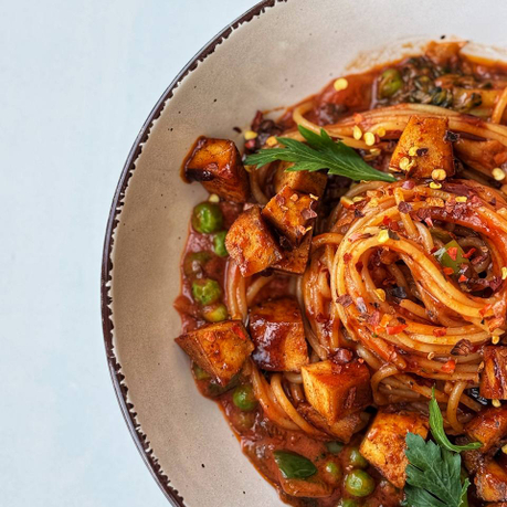 - Тофу с грибами, томатами и специями